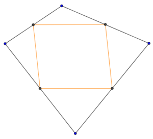 It sure looks like we’ve built a parallelogram, doesn’t it? The amazing fact here is that no matter what quadrilateral you start with, you always get a parallelogram when you connect the midpoints.