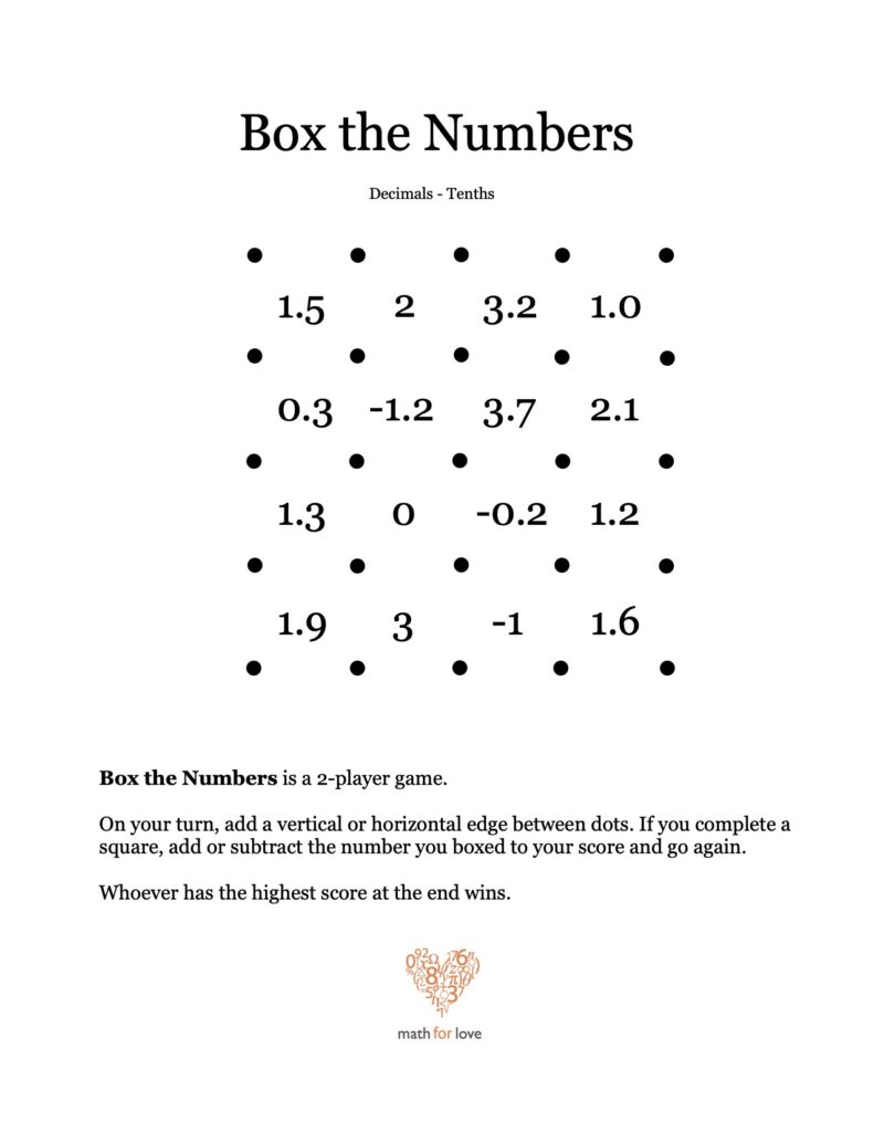 Box the Numbers is exactly like the classic game Dots and Boxes, except that when you complete a box, you don’t simply get a point. Instead, your score changes by whatever number you boxed.