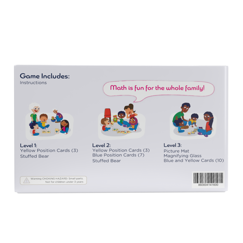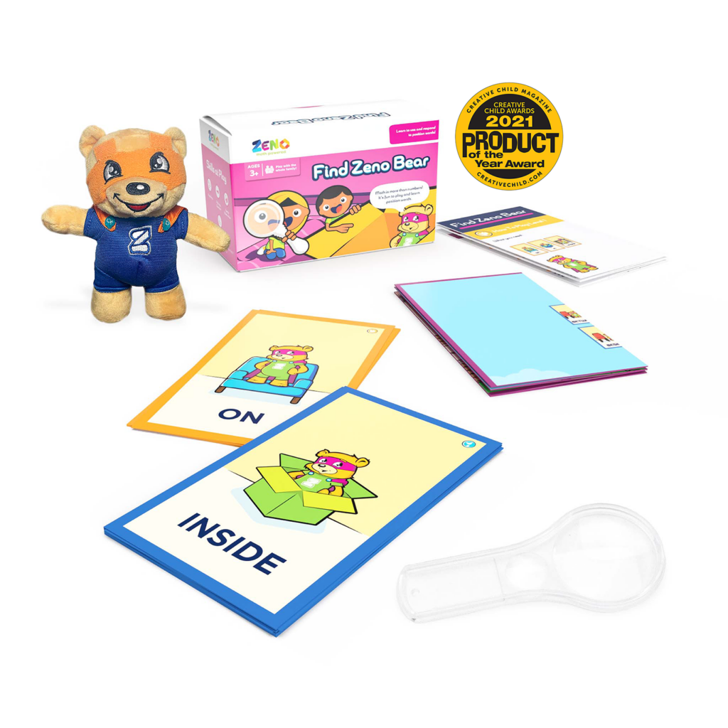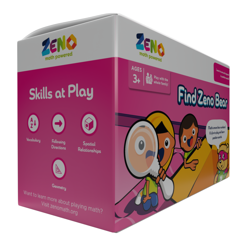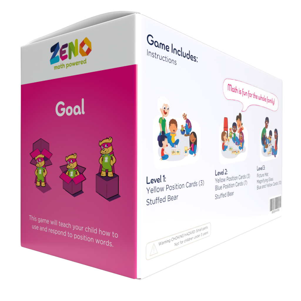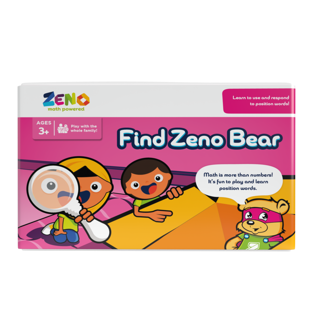 Find Zeno Bear contains three levels of play to engage children between the ages three to five in developmentally appropriate math play. By learning to use positional words, kids lay the foundation for understanding position and space, central concepts in mathematics. Kids will love the stuffie included in the game too!