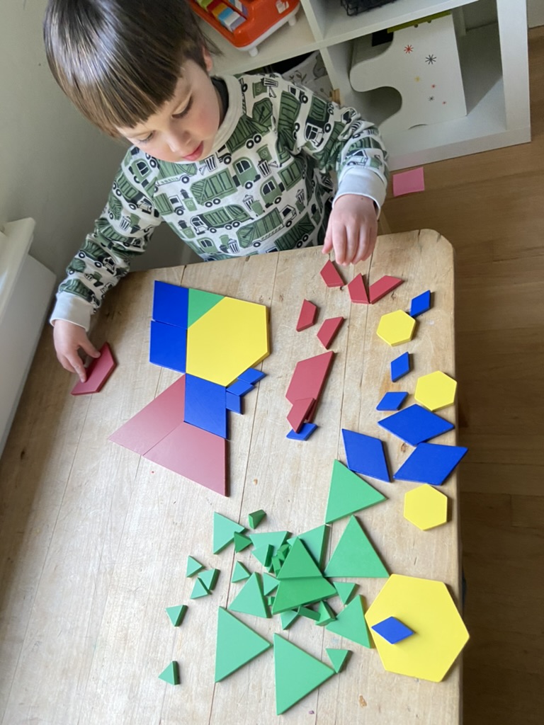 We’re also very lucky that the grandparents in our life are pros working math into their interactions without it ever feeling forced or pedantic. Playing a game of war with his “Mima” provides the opportunity not just to compare greater/less than between the cards, but also to count the cards at the end. I missed the count on the larger deck, but caught them counting Mima’s (smaller) pile of cards. Frankly, if you’re playing games like this and counting this naturally, your kid is going to be ready for Kindergarten and then some. Listen for the tone change when he gets to 10 – that’s a classic sign that he’s understanding the cardinality of the set of cards: 10 is not just a word in the counting series; it’s the size of the set. You can model that kind of intonation when you count with younger kids!