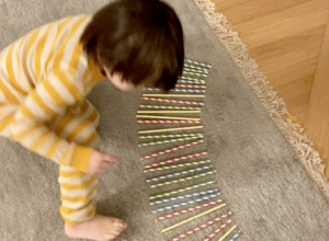 Here he is counting a larger collection. You can see him slowing down his count to make sure he aligns his hands and his words. Again, the motivation to count these straws came entirely from him – I was just lucky to catch it on camera. Note – this video wasn’t embedding for some reason, but you can click the link below to watch it on vimeo.