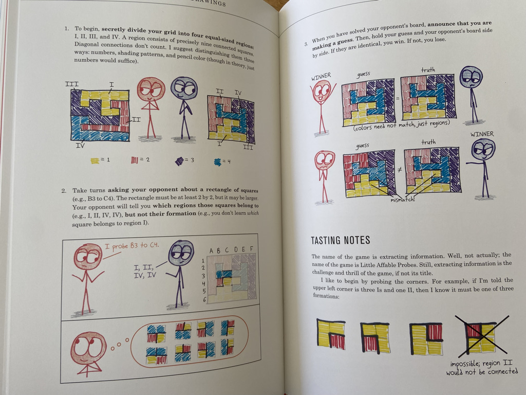 Second, Orlin is a pleasure to read. His writing is clear and goes down easy. At times, I found myself laughing out loud. There aren’t many people who can demonstrate the fun they’re trying to tell you about. Each game comes with tasting notes, for example, and the bibliography is, oddly, a FAQ. He’s a deeply competent, humorous writer, and it’s fun to read his work. The drawings are, in their own way, quite magnificent as well, making complex games clear in blow-by-blow illustrations.