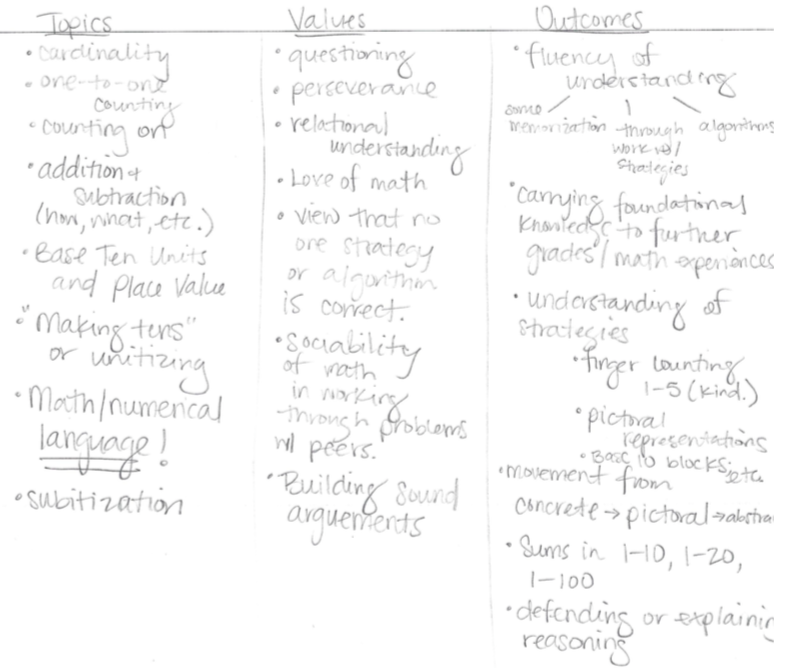 What do you think are the aims and goals of math education for grades K-2? Include topics, values, and outcomes.