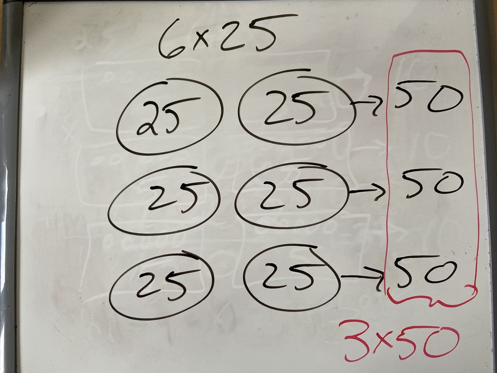 That’s cool! And you can use the same idea for the big question: 6 x 25 must be the same as 3 x 50.