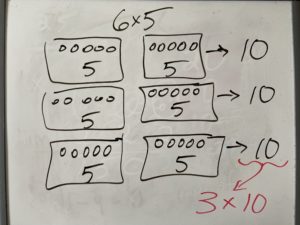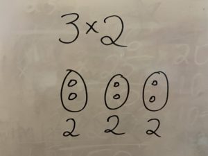 In my drawing, I’ve got 3 x 2 representing 3 GROUPS OF 2. Could I make a drawing of 3 x 5 then? Of 6 x 5? Of 6 x 10? Suddenly it doesn’t seem as hard. By making things simpler, you’ve actually created a ladder to climb down, and then to climb back up again!